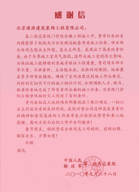 第二炮兵總醫(yī)院項(xiàng)目感謝信