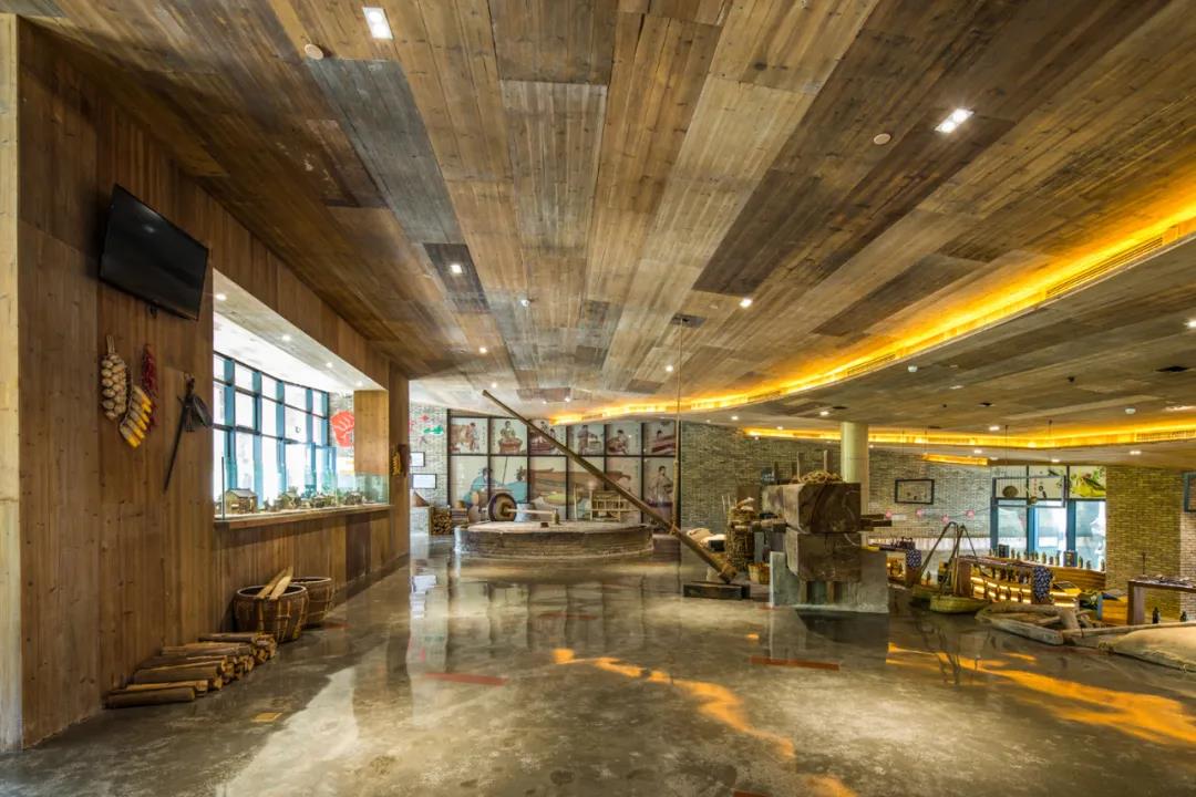 為了給游客帶來沉浸式體驗(yàn),港源裝飾項(xiàng)目團(tuán)隊(duì)在針對(duì)茶油工坊進(jìn)行室內(nèi)裝修時(shí),安排專人去當(dāng)?shù)卮迓渲兄饝魧ふ以鷳B(tài)老木板,加以梯田式屋梁造型施工,從細(xì)微之處便竭盡所能地還原我國(guó)古老文明的古樸雅致和文化底蘊(yùn)。