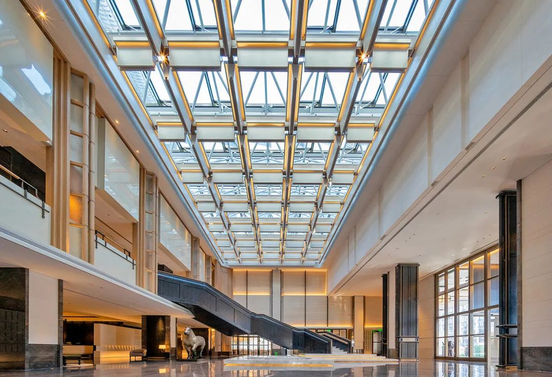 挑高約10米,頂部為造型復(fù)雜的鋁板采光頂